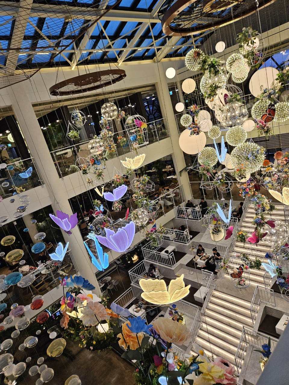 가장 눈길을 끄는 부분은 천장에서 매달린 꽃과 조명 장식들입니다. 다양한 빛의 색깔로 바뀌는 LED 조명과 조형물들이 어우러져, 밤에는 더욱 화려한 분위기를 연출합니다.